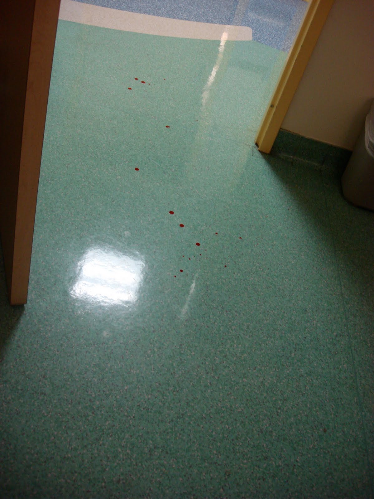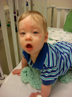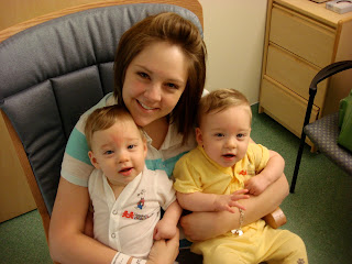I went down to the pharmacy to get their prescriptions filled & while we waited for those to be ready, we received the discharge instructions. Chris then had to go pick the prescription meds up, so I was left in the room by myself with the 2 (Chris had help when I went downstairs – haha)! It was crazy! When they got really fussy, I picked the boys up & walked them down the hall some. But then, my arms felt like they might break off so I made a bee line back to the room. As soon as I thought I might loose my mind, our friend from the special needs job-op showed up. She talked to the boys while I rocked them, and they quieted right down! The last thing the boys had done was to have their IV’s removed. Of course we couldn’t leave with out a little bit of drama. As soon as the nurse took out Maverick’s IV, he started bleeding everywhere out of his IV spot! He got Chris, himself, 2 nurses, and the floor!
