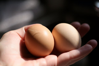 - These are some eggs I got at the Farmer’s Market last week. When I took one out of the fridge, you can see how “fresh” it is… there is a little feather on the left one! I LOVE it! Just wish I had chickens in my back yard! (You have to look really hard. I thought I had focused in on the feather when I took the pic, but lo & behold the focus thing keeps on baffling me! I need my sister to give me more lessons!)