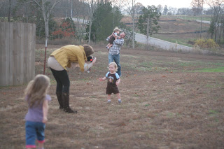 Thanksgiving was fun as we went to GA for a few days. We drove through the night on Tuesday & arrived at 2am Wednesday morning. Driving through the night did not help the screaming children at all. The good news was that we could put them to bed right away & not deal with crankiness until bedtime. Honestly, the car was a very small and very loud place to be at times, but we survived. Portable DVD players are awesome! We drove Tuesday night, recuperated Wednesday, then drove 2 1/2 more hours on Thursday to Alabama for Thanksgiving. We had a great time with family – saw Chris’ grandfather (little ones great grandfather!), extended family, ate yummy food, and let the kids play in the yard a while. We left around 5:30pm and it was the only silent trip we had b/c the kids slept the whole way home since they didn’t have naps! It took me back to the days when Chris and I were first married and it was only us in the car. It was weird and memory evoking. Friday, we recuperated from Thanksgiving & went to visit some dear friends that night. Saturday we had a mini-reunion with dear friends at church. Jo opened her home to all these sweet people, and it was wonderful to see so many faces that we love! No one had met the boys yet, so while very over-stimulating to the boys, we had a great time! (During the fun, Warner ended up busting his eye/cheek on a chair and breaking out in hives due to antibiotics. Poor little buddy is one tough cookie.) We all took naps after that and then drove back to TN that night. Last hour in the car, all 4 kids screamed & cried. I almost cried when I saw our house! Yet, we survived and have great memories and stories to tell from it! ( I took no pictures in GA. I forgot my camera)