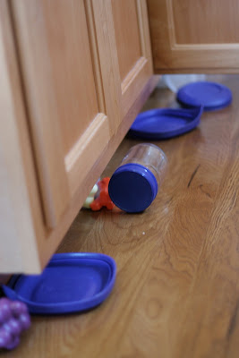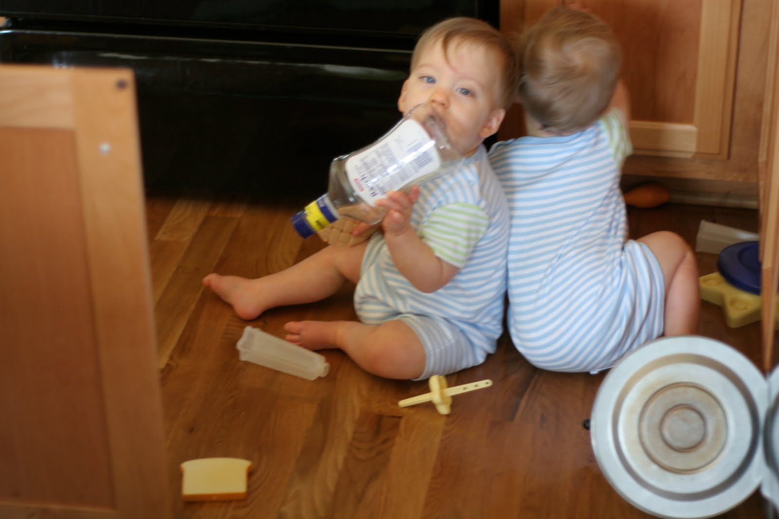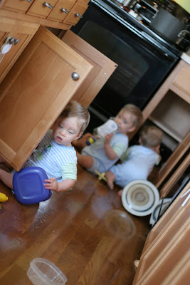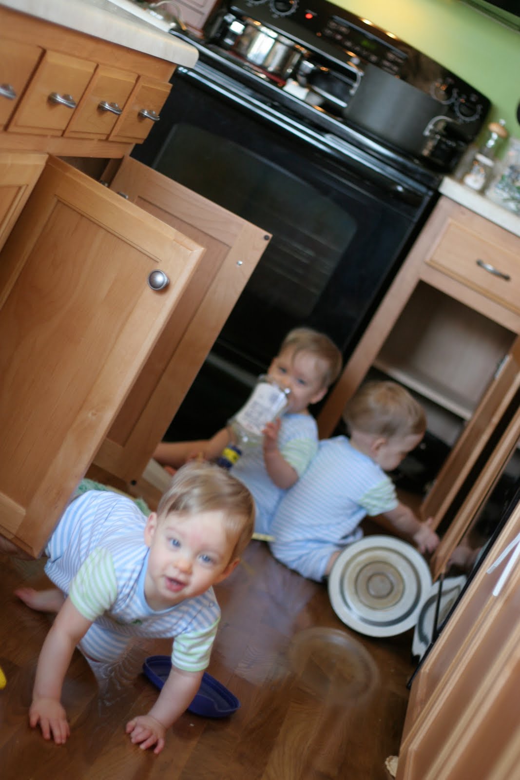 You may want to leave one cabinet with plastic containers and other interesting items that are not always readily available. That way, in a pinch… you can unlock the cabinet and let the entertainment begin. We always thought that the plastic tableware that we used once a year when camping was a good option to let the kids dig out of the cabinets while we were cooking or sitting at the table doing bills. When we were done, we could just throw them back into the cabinet very quickly and disorderly, because we knew the next people to visit that cabinet, would be the toddlers. LOL. Ours are now teens and we miss the days that plactic kept everyone entertained. I am so happy that you are catching these moments in pics and journals. You will treasure this.