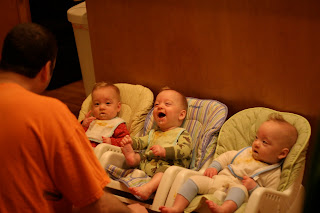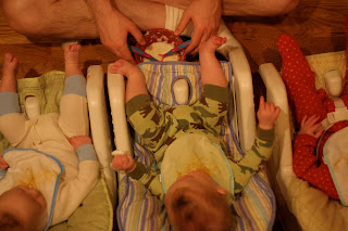 We now have their highchairs on the ground. They just took up too much room on the table, so now they sit all lined up (see below). They get so frustrated b/c by the time brother #3 is being fed brother #1 is screaming for more. My pulse races & I sweat when I feed them because it takes lots of concentration! ha ha! I’m getting much better, but they are somewhat demanding little fellas!