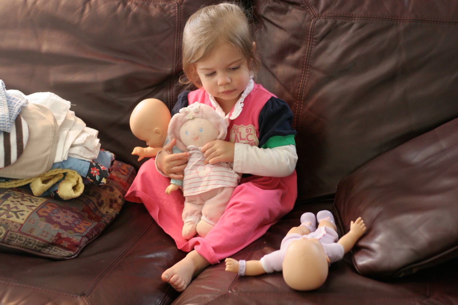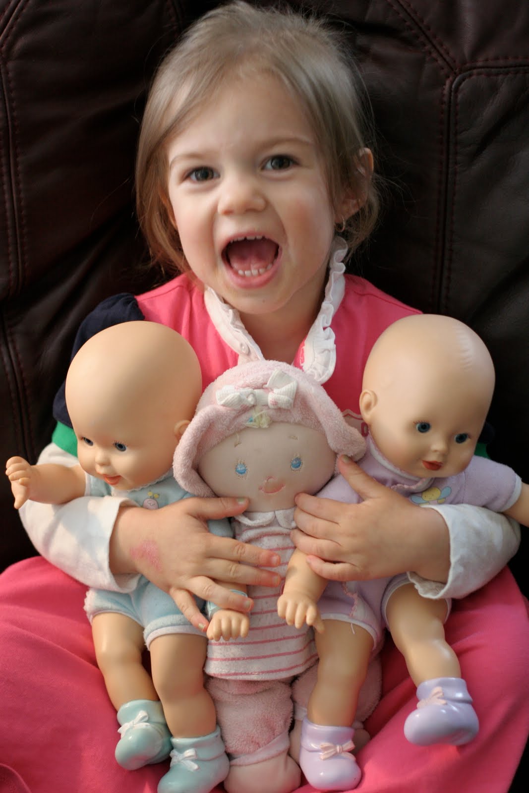 Then, I thought maybe that was just a one time thing.. this “Harper with her three babies.” However, now she rarely plays with just one. The popular line up these days are: Baby Carol, Baby Amy-Jo, and Baby Jackie. (all of her babies are named after some of the women Chris works with… hilarious! They are godly women & I love Harper chose those names!!!)