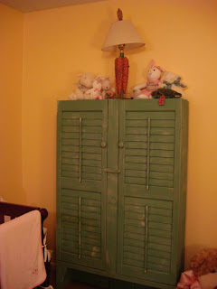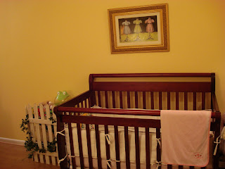 So I really wanted a picket fence in Harper’s room, but I’m going to have to come up with a better idea than this one because she keeps pulling this one over. The ivy is fascinating to her 🙂 Behind it though, is a shelf with several of her toys on it. When I need to get a shower, I will sometimes put her in her crib with lots of toys for her to play. The frog is a humidifier we got at Target. When I first used it, I thought it was kind of freaky because the steam shoots out of his eyes. Haha!