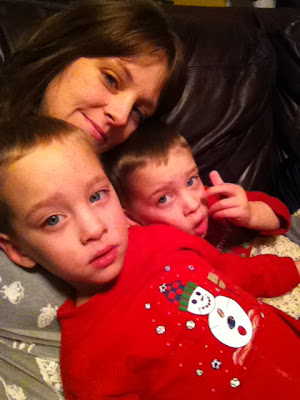 Snuggly time. Crews and Warner. Oh, and Warner, just like Mama Dot, points at everything with his middle finger.